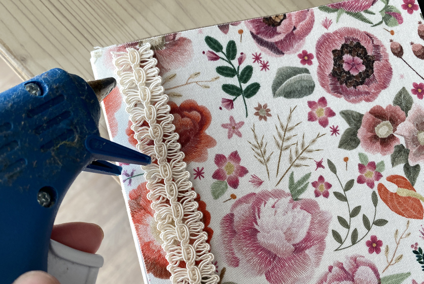 무언가 허전한 느낌이 들어서 집에 있는 모양 끈을 글루건으로 붙여 포인트를 주었습니다. 앞면에만 붙였어요.