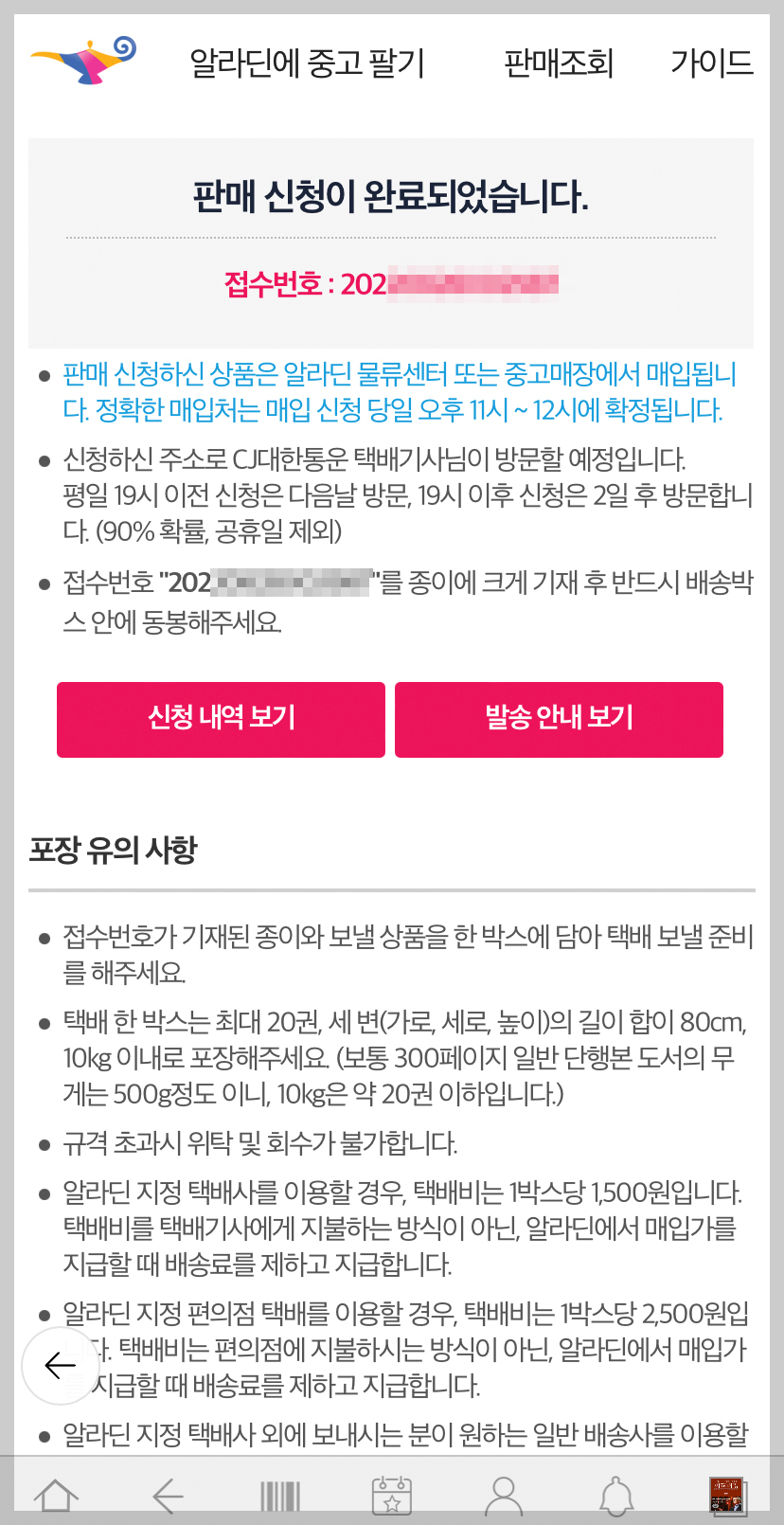 7. 판매 신청 완료. 택배 포장하기.